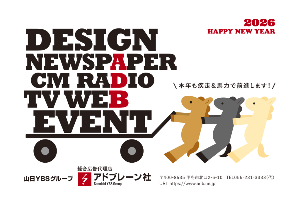 午年の2026年、アドブレーン社は「馬力全開」で走ります。DESIGN、NEWSPAPER、CM、RADIO、TV、WEB、EVENT――あらゆるメディアを駆け抜け、アイデアでスピードを、戦略でパワーを。お客様のビジネスを、ゴールのその先へと押し上げます。