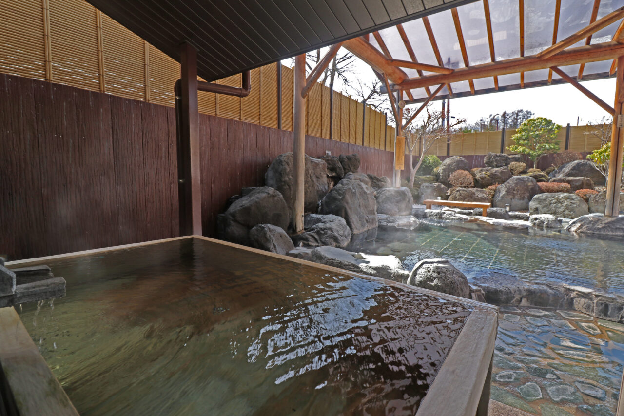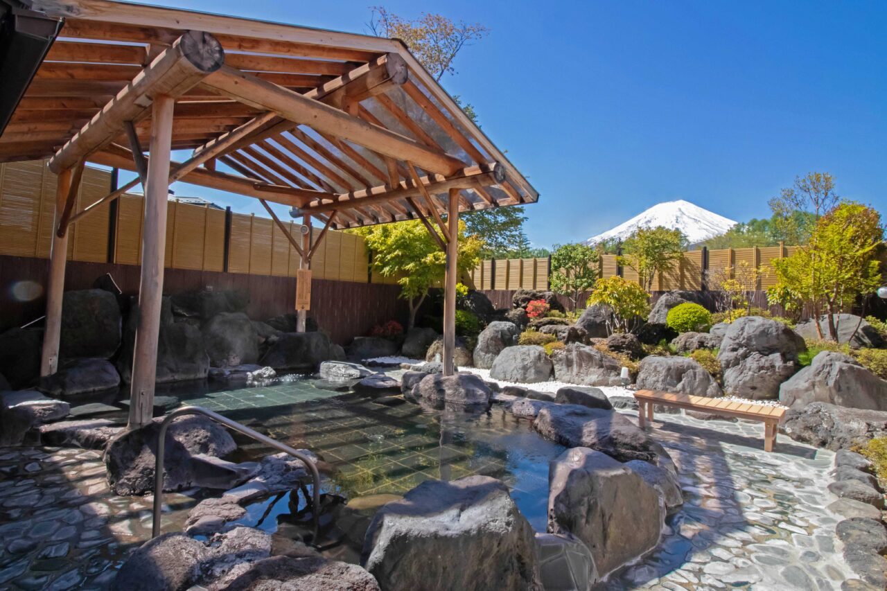 浴壁・浴床には富士山の溶岩素材を使用し、マイクロバブル発生装置(超微細な気泡)など“疲れを癒す”設備が充実している『富士山溶岩の湯 泉水』。富士山麓ならではの特権として、露天風呂からは雄大な富士山が眼前に広がります。