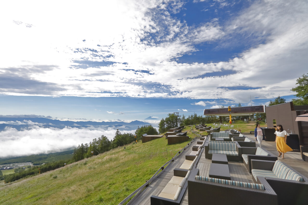 八ヶ岳南麓、清里高原にある「サンメドウズ清里」。標高が高く、爽やかな風が流れる気候で、とても過ごしやすい場所。晴天率も高く、条件の良い日には富士山をはじめ、想像を絶するほどの景色を見渡すことができます。遮るものがないパノラマビューに、訪れる人々の歓声が沸きあがります。