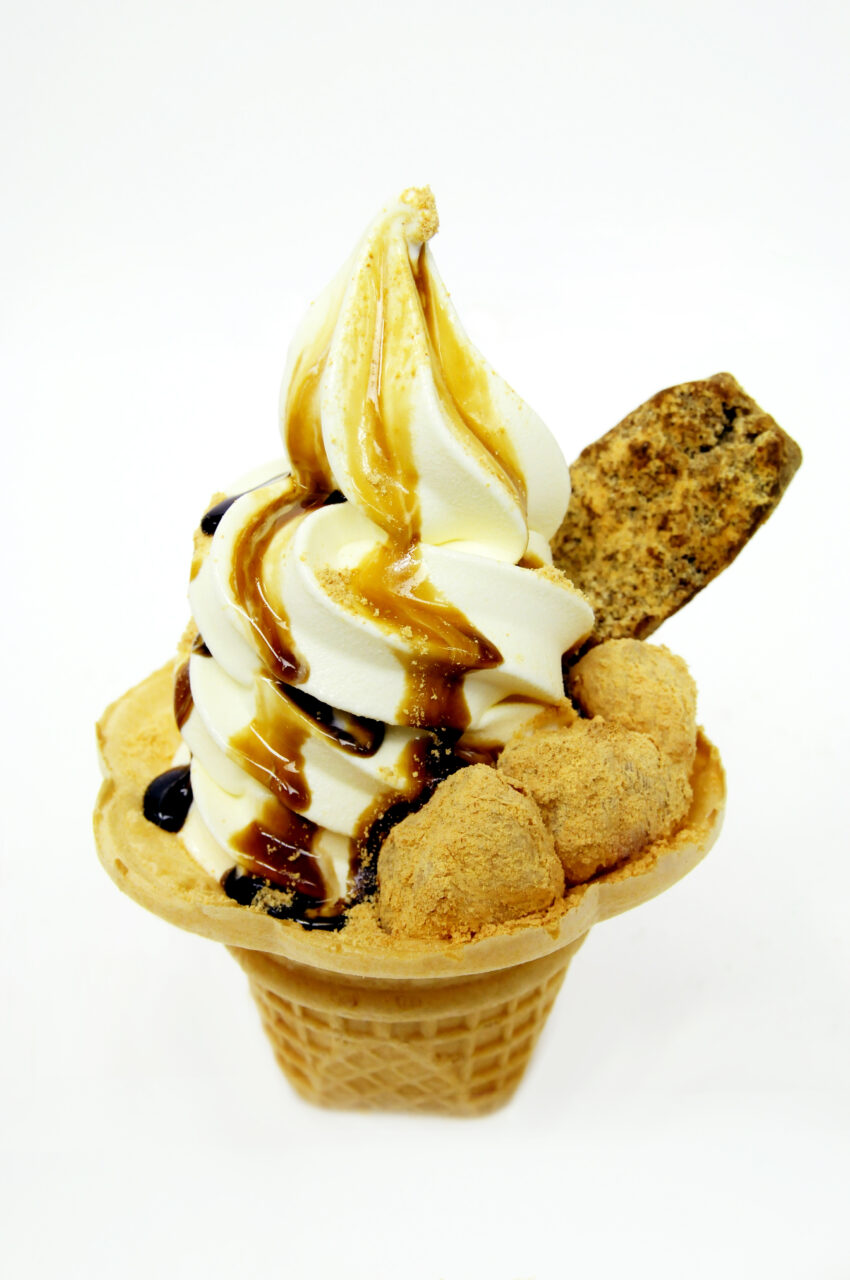 山梨土産でおなじみの桔梗信玄餅をアレンジした『桔梗信玄ソフト+』は、青空の下、ぜひ味わってみたい一品。香ばしいきな粉と、濃厚な黒蜜がたっぷりで、口いっぱいに豊かな味わいが広がります。