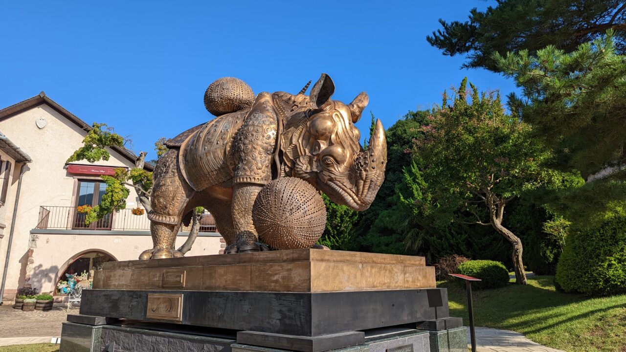 中庭には、奇才サルバドール・ダリが製作した、黄金のブロンズ像「レースをまとったサイ」が展示されています。日付入りのパネルも用意されているので、時価8億円のサイと一緒にぜひ記念写真を撮ってください。運気が上昇するかも?!しれません。